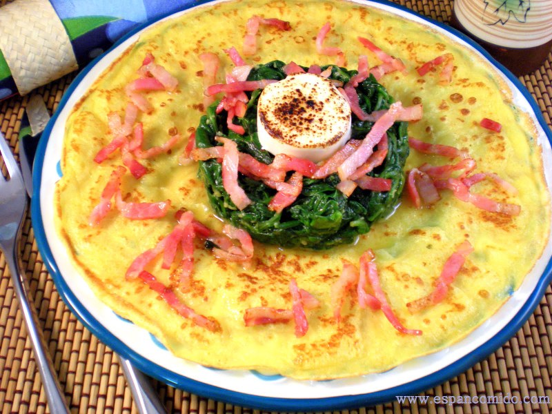 La receta de hoy,  Espinacas salteadas con bacon y queso de cabra las serviremos sobre unos finos crêpes, que le dan originalidad a un plato tan sencillo como este. Así que podemos decir que en muy poquito tiempo, tenemos un vistoso plato para sorprender a los nuestros. Por favor, dadme la razón de que este plato ¡Es Pan Comido!